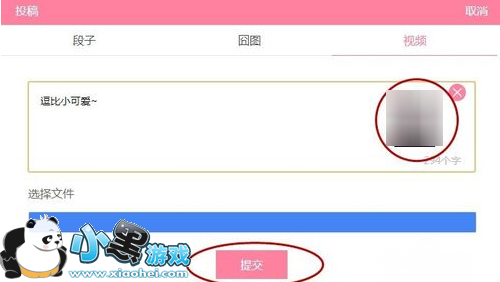 4.点击投稿后,出现如图所示的画面,选择“视频”选项,在文本框里输入所发视频的标题,点击“.选择文件”,选择视频所在的文件路径;