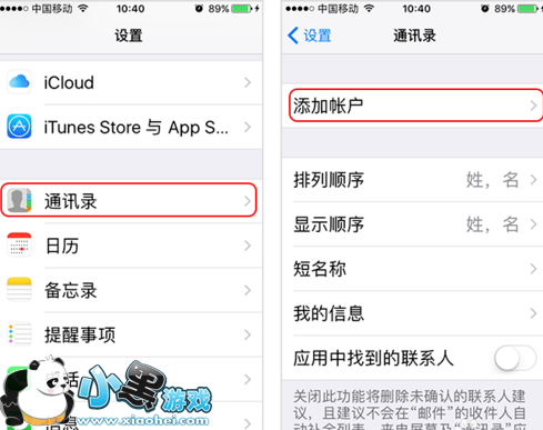 6.点按“通讯录”,然后点按“添加帐户”。这将列出 “帐户”的标题,允许你选择不同帐户。