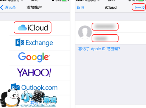 7.点击“iCloud”,输入您的iCloud用户名和密码,然后点击“下一步”。完成以后您要仔细检查是否已启用通讯录同步功能。