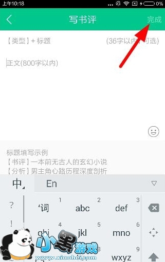 2、然后用户就可以进行写书评了,正文字数要在800字以内,写完之后,就可以直接点击右上角的“完成”。