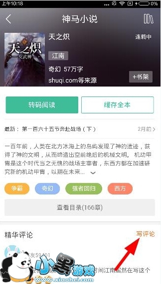 1、用户进入小说的详细页面,然后点击下方的“写评论”,如下图: