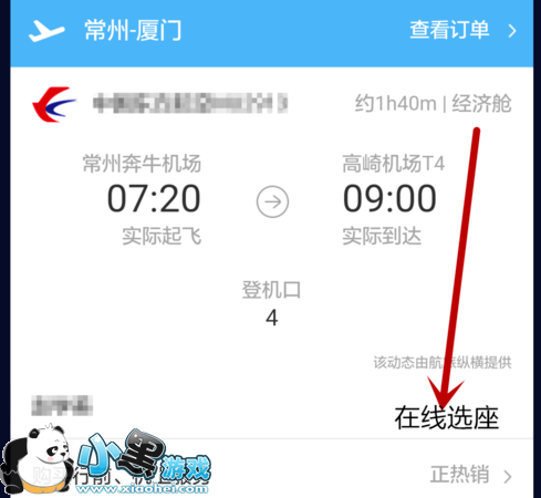 4.点击进入航班动态,里面会有在线选座的按钮,可以根据自己的喜好提前24小时将自己的座位选好,有同行的小伙伴可以把座位选在一起。