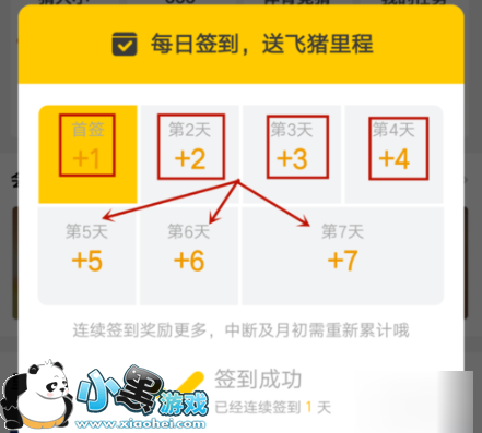 1.登录签到:每天飞猪手机客户端签到能够获取里程,每天获取的里程7天一个循环,呈等差数列的形式(1到7),如图所示