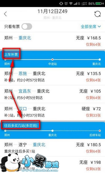 4.还不止这些,最人性化的一点是“上车补票”功能,可以自动检索可靠的出行计划。再也不用为多坐会而费力的去查路线上每个站的余票了。