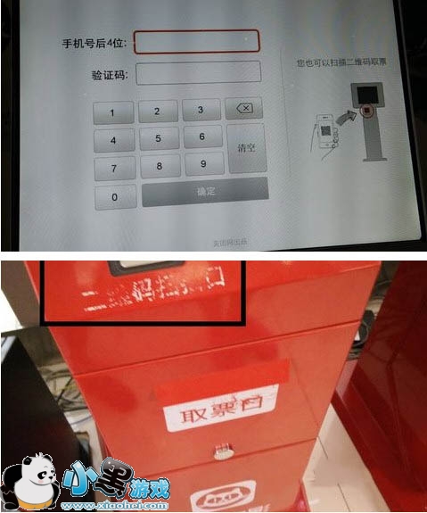 2、可以选择手动输入手机后四位和兑换码,或者扫描二维码取票,二维码扫描口位置如图示。