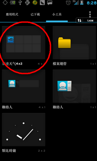 7、进入之后选择墨迹天气的图标,选择自己喜欢的比例,通常有4X1和4X2选项,这个决定在手机桌面上占用大小比例