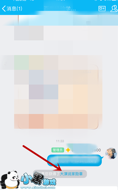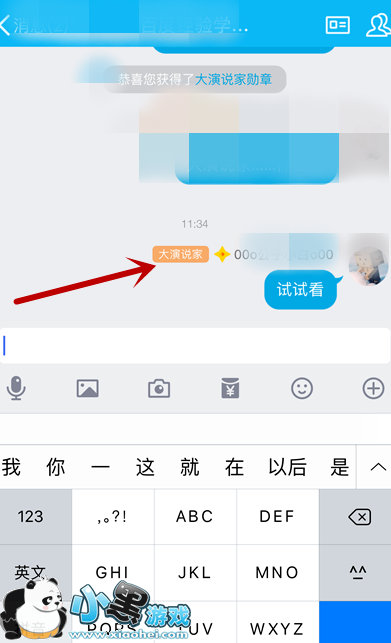 3.你就会发现有一天,你在说一句话之后,你的下面会有系统提示你获得了大演说家勋章。我们点击一下这个位置。