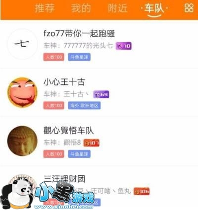 5、进入车队后可以看到很多大神建立的车队,可以看到车队建立者的昵称,可以看到车队的人数,一般车队人数满员为100人。