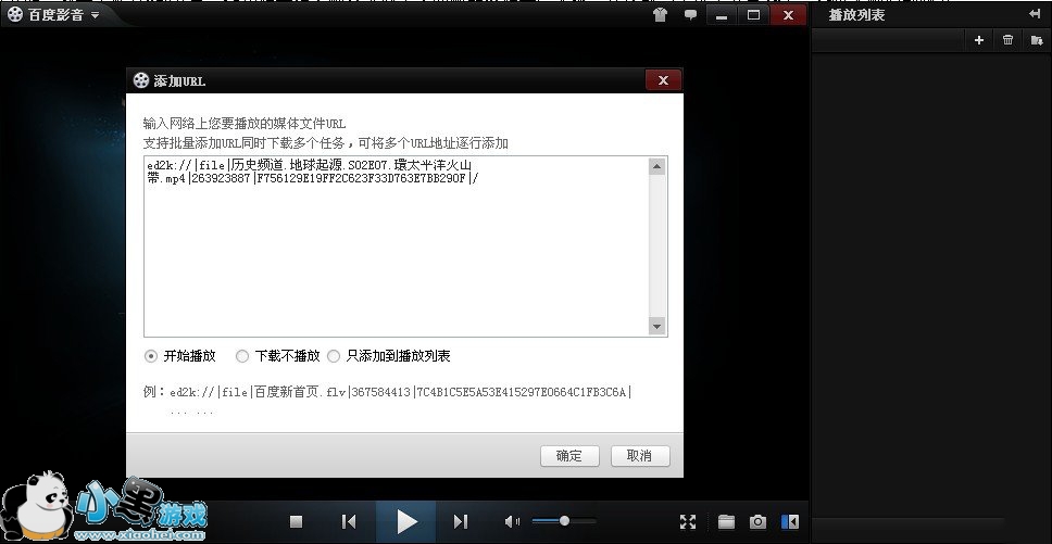 点击添加URL后会弹出一个输入ED2K链接的对话框,此时你把刚才在BT盒子种子搜索神器复制的播放地址粘贴进去,点击确定,如图4: