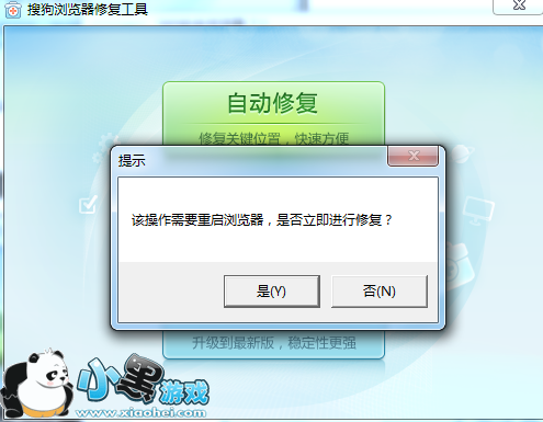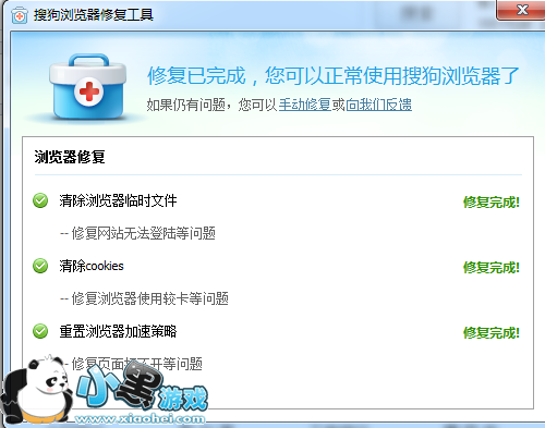 4、自动修复完成后,提示修复完成,关闭提示框,重新启动浏览器即可