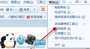 3、在帮助下拉菜单中选择浏览器修复工具或者按快捷键F1