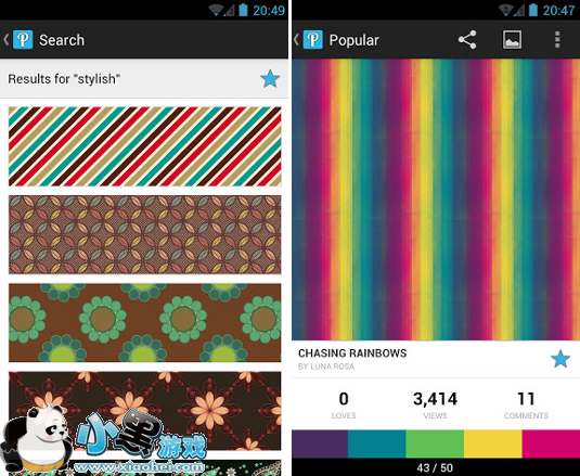 别看Pattrn的功能只有一个,它却把这一功能实现得相当完美。你可以使用这款软件去色彩主题讨论网站COLOURlovers上面选择你喜欢的配色方案,并把它作为你的设备的桌面背景。Pattrn的功能实现并不复杂,不过它作为一款能够适配各种各样的屏幕尺寸和方向的应用确实为其他 Android应用设计树立起了榜样。