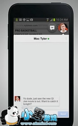 1点25分:当你收到信息,在侧边会弹出聊天人物头像。如果点击头像,就可以打开聊天窗口。Facebook称:“聊天头像(Chat heads)可以让你迅速与关心的人进行个人联系。”。