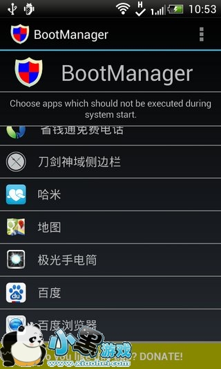 有了这个程序,模件,可以防止在系统启动时运行的应用程序选择。只有应用程序的权限BOOT_COMPLETED显示在列表中。系统的应用程序都标有感叹号。