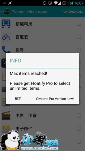 不是所有的通知都一定要浮窗显示,短信、社交软件等来个通知,弹窗一下还比较合适。Floatify 支持自选显示通知的应用,Free 版最多支持 5 个,对于重度社交控来说,5 个还是太少了,且不支持 QQ。
