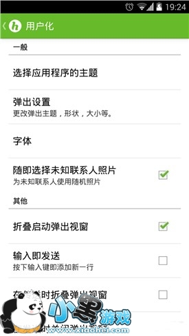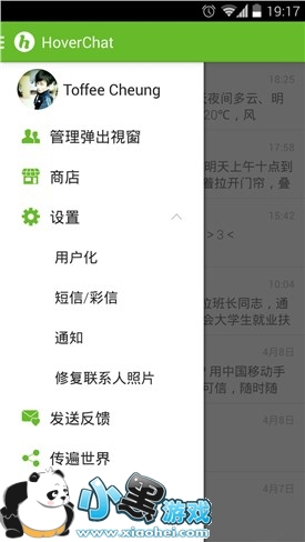 浮窗是 HoverChat 的精髓。当有短信到来时,屏幕上仅会显示来信人的头像,并不十分妨碍当前的浏览以及操作,而且你可以按住头像将其拖到合适的地方。点击头像,信息随之展开,并可直接进行回复操作,避免了在应用间切来切去的麻烦。浮窗的大小可在「用户化」→「弹出设置」中进行调节。
