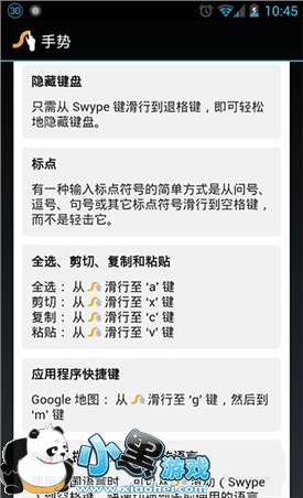 除了滑行输入文字,Swype 还有很多其他采用滑动手势的快捷操作。比如从“swype”键滑到“退格”键可以快速隐藏键盘等等。