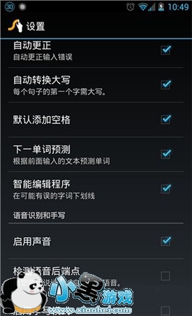 在设置里面可以开启许多智能输入选项,比如自动更正,首字母自动大写,单词预测等等。