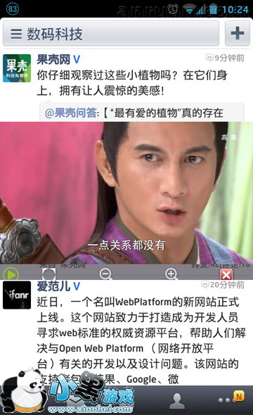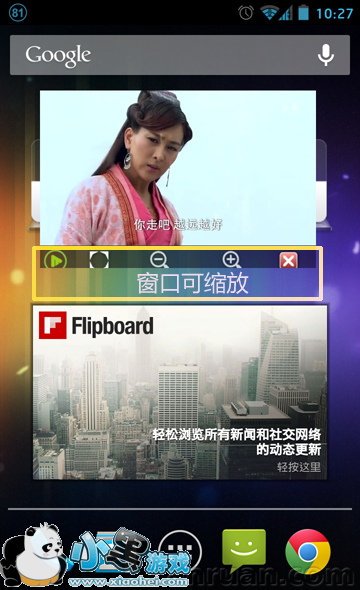 小窗口播放这是MoboPlayer视频播放器的一大亮点。当在全屏播放视频的时候只要按一下Home键就会转变为小窗口播放(默认模式下如此,Home键的功能可以另外设置)。小窗口视频的窗口大小和位置都可以调节,这样就可以边看视频边刷微博了,如果你有需要的话。
