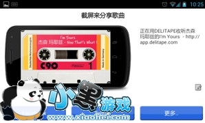 通过创建个性截图分享自己正在听的歌曲,截图界面为一个手机快照,原始分享按钮只有facebook 和 twitter ,国内的用户可以点选“更多”来分享到微博或通过其他工具打开。