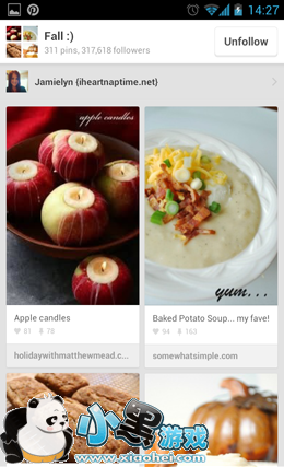 Pinterest,Pin(图钉)+Interest(兴趣),把自己感兴趣的东西用图钉钉在钉板(PinBoard)上。Pinterest网站作为瀑布流(页面底部自动加载内容并附加至当前尾部)的首创者。已经上线两年,这次Android和iOS客户端同时发布,把瀑布流引入移动领域,让用户不断发现新图片,这是该公司首次推出移动客户端软件,但是体验还是非常不错的。