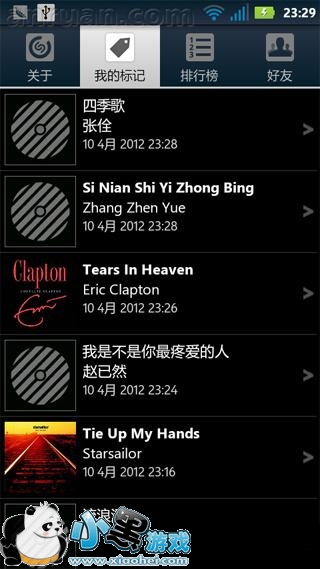 相信看到名字或者截图的网友们有很多熟悉这款应用的,在安卓平台一共有两款音乐搜索识别软件,一款是我们今天的主角Shazam,一款是 Midomi SoundHound(猎曲奇兵)。小编经多测试对比,Shazam对歌曲的识别率较高,而Midomi SoundHound对人声哼唱(随便哼唱一段旋律或者歌词)的识别率较高。如果大家不嫌麻烦,可以两款软件一起安装。下面请大家随小编一起看下 Shazam对歌曲的识别能力,我们用touch上的豆瓣FM随机播放一首中国民谣歌手赵已然(赵老大)翻唱的流浪汉,在音乐播放10秒多的时候,Shazam就准确识别出了音乐的演唱者和歌名。因为这首歌没有正式发行,所以软件只显示了演唱者和歌曲名。至于共享,toutube等功能我们在天朝是无法使用的,所以大家可以自动忽略。