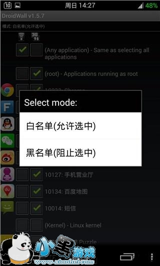 DroidWall 是一款控制应用联网的实用工具,与各位熟知的 360、LBE 一样,它能够自动识别应用的网络使用环境,并支持黑名单和白名单两种模式。顾名思义,黑名单模式的意思是选中的应用不允许联网;而白名单模式则恰恰相反,只有选中的应用可以联网。