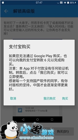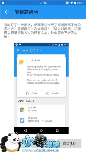 Inputting+ 同样可以实现 Type Machine 的输入时间线功能。Inputting+ 中的输入时间线功能需要付费解锁,支持 Google Play 付款或支付宝支付。支付宝支付结束后点击我已购买即可解锁。开发不易,请大家支持正版。