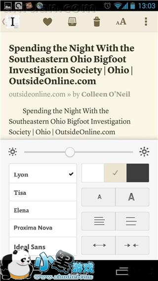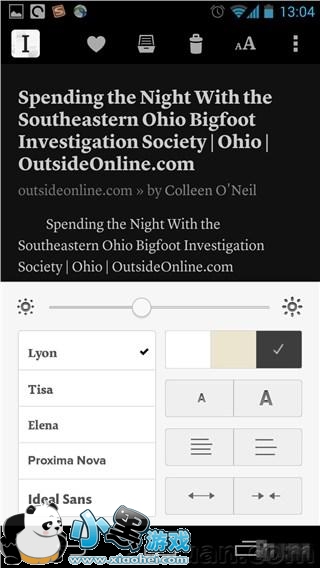 而在阅读细节上,Instapaper把控的更加人性化,状态栏上可以调整字体,调整屏幕的亮度,文字行间距,甚至是阅读的背景上都可以进行详细的调整,新闻纸或者牛皮纸的背景,要是晚上阅读的时候觉得明亮的背景实在刺眼,那么就调整成全黑的背景,坐在床边,静心夜读。