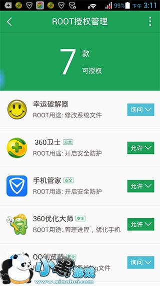 - 最安全:360独有的安全检测机制,超过7年在安全方面的累积,全面保护您的手机ROOT权限免受恶意程序滥用;