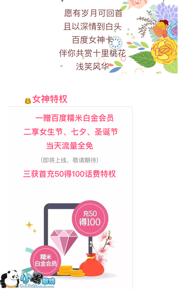 •体验特权:“百度女神卡”激活当月免月费,享受套餐内容。
