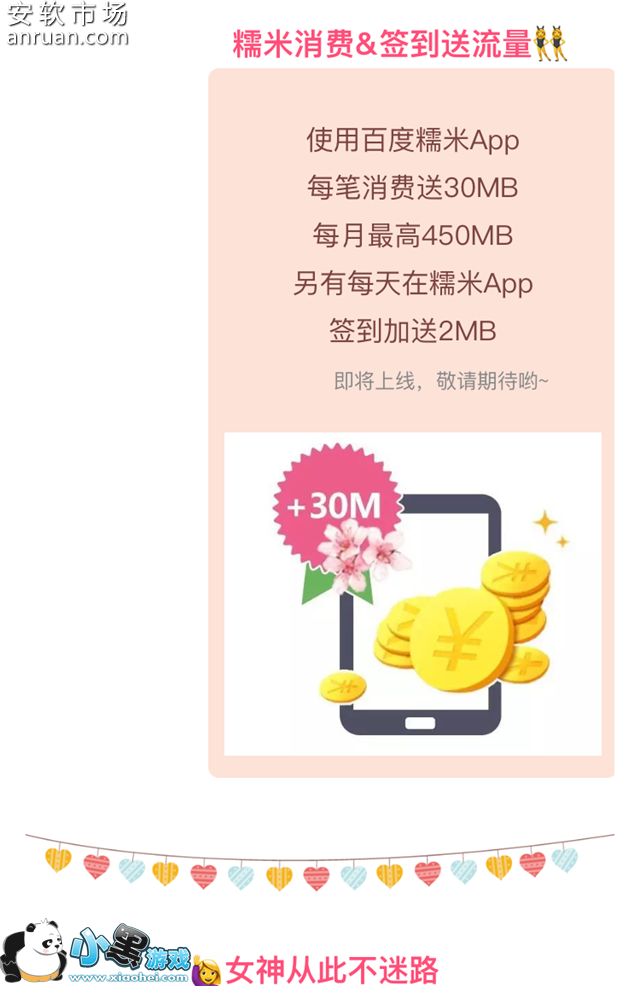 1、“百度糯米”APP消费一笔送30MB,“百度女神卡”每月最多可获得450MB。