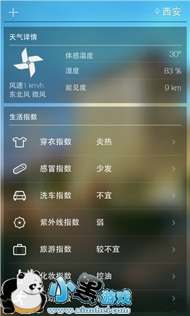 与雅虎天气类似,向上滑动可查看更多天气信息。并且采用与雅虎天气类似的毛玻璃风格。但是最美天气摒弃了雅虎天气中「地图」、「降雨概率」和「太阳和月亮位置」等「鸡肋」功能,取而代之加入了「天气趋势」和「生活指数」等使用功能。