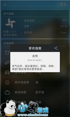 生活指数中点击可以打开查看详情,并且可以以图片的形式通过 QQ、微信和微博等方式分享给好友。