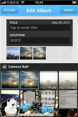 可以在相册里面批量选取照片,然后通过彩信、邮件和社交网络分享给朋友。