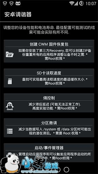 - 支持一键调整、调整ROM、内核、存储访问、内存管理器等
