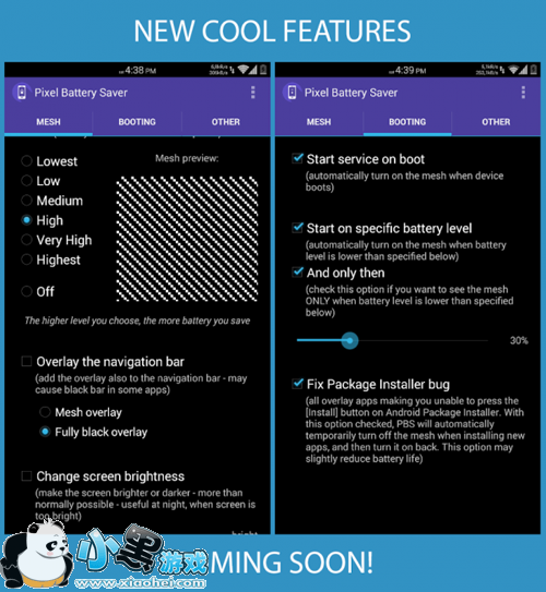 尽管给手机省电并不是什么新的概念,但显然很多用户并不能充分利用这项能力--关闭Android智能手机上的屏幕像素。消费者在追求视觉冲击的同时也希望能够获得更长的续航表现,并非所有机型都能同旗舰Galaxy S5或者HTC One获得超级省电模式,那么有没有通过关闭像素达到省电效果的解决方案?Pixel Battery Saver可能就是你所追寻的答案,一旦激活之后能够让部分屏幕像素处于非活跃状态,进而达到省电效果。 像素省电下载 软件名称:像素省电 软件类别:系统工具 软件语言:英文 系统要求:Android4.1+ 软件大小:2M