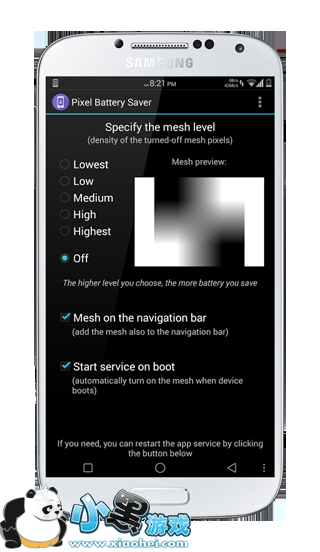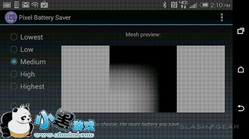 像素省电 Pixel Battery Saver省电效果小编个人觉得是应该算比较节约了。不过小编中感觉那个眼睛受不了的说。看一下下还好,真的要在蜂窝状的屏幕上稍微盯久点就会浑身难受。不过在关屏状态下使用这个功能应该会很有效的节约用电,友友们不妨试试看,效果好的话要记得来告诉小编哈。
