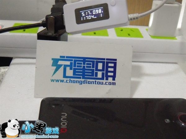 先是nubia Z5S与标配5V 1A充电器测试。通过“白尾巴”电流电压表上的LCD屏幕可见,实时监测到的电压为5.17V,这个比标称的高了一些,实际到达手机端线损会降低一部分电压。