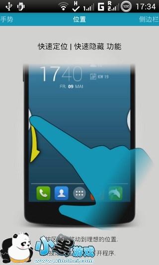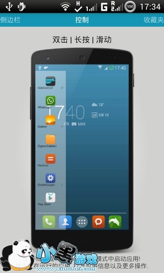 侧边栏控制 SideControl 能够通过手势操作让您完全掌握手机应用及通知等,让你玩转手机。你可以通过侧滑、手势等进行个性化的定制操作习惯,内置了多种操作方式,完全符合绝大多数人群的操作习惯,支持锁定您的手机,终止所有正在运行的应用程序,切换到最近的应用程序或滑动打开最新的通知。