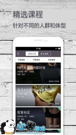 训练计划针对不同人群、各种器械和阶段健身目标组合编排,适用最广泛的健身场景。
