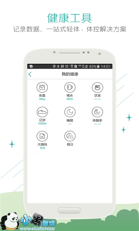 3、健康工具:提供体脂率,步数,饮食,睡眠,大姨妈等数据的记录提醒功能。APP+智能手环,软硬件结合,做专业的体控专家。