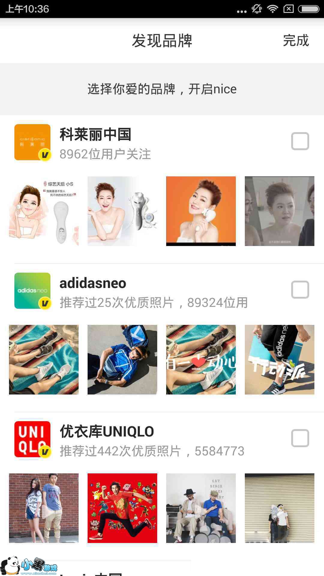 进入软件后系统会让你挑选一件自己喜欢的品牌以便于确认你的偏好。比如科莱丽中国,阿迪达斯,优衣库等等,这里有非常多的品牌供我们选择,在选完以后我们就可以进入主页了。