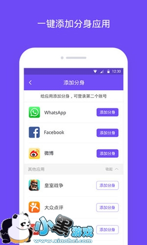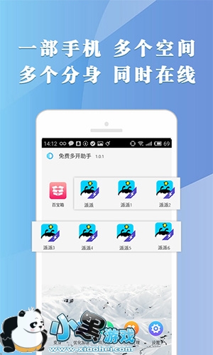 多开助手,可以让您在同一部手机,同一个APP分身同时登陆多个账号,省去您需要带多个手机,或者账号来回切换的麻烦。全球首款免费多开类APP,免费支持社交软件、娱乐、游戏应用、购物、视频、音乐等等几乎所有APP的双开,多开,分身,解决用户的多账户需求。