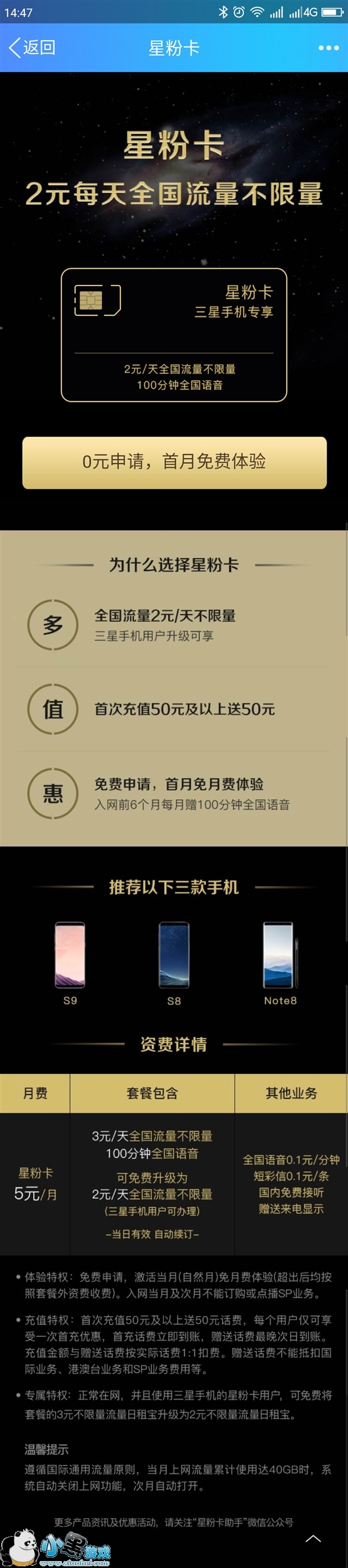 星粉卡月租5元,每天3元可享全国流量不限量,三星手机用户可免费升级为2元/天全国流量不限量,套餐外全国语音0.1元/分钟,短彩信0.1元/条,国内接听免费、赠送来电显示等。