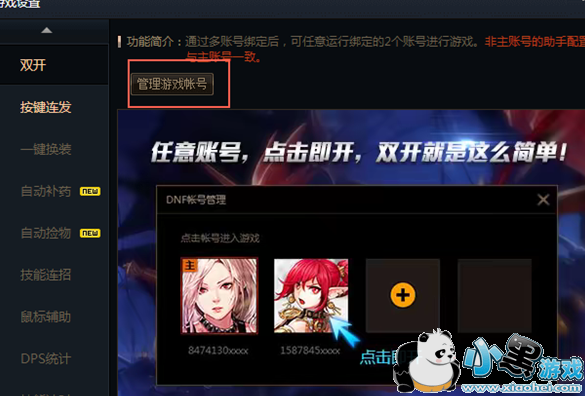 3、点击管理游戏账号,就会出现主号和小号的添加管理,如下图
