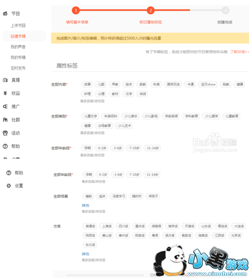 2.选择节目功能下的创建专辑,上方的流程条清晰地展示需要完成三个步骤:填写基本信息、标记属性标签、创建完成。