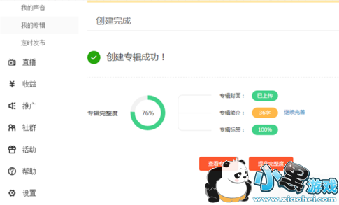 6.系统提示创建专辑成功,还可以对专辑完整度进行提升,例如将专辑简介再仔细描述可以提升曝光率。