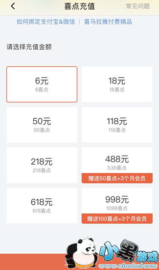5、之后,可以看到,我们的喜点最低是充值6元起,一喜点一元。并且充值金额多的话还会送上喜马拉雅APP的会员权限。
