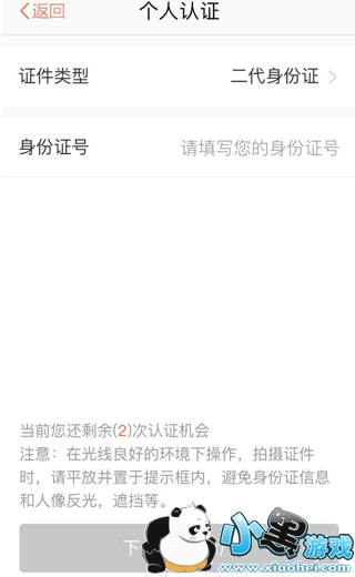 4、然后需要准备身份证,我们先把身份证号码输入进去,点击下一步。后续要验证是不是本人,所以身份证所有者一定要在场。